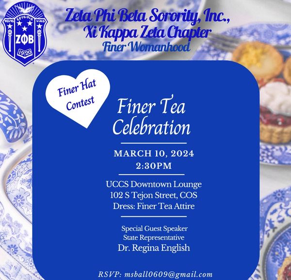 Local State Chapter, Xi Kappa Zeta Chapter, Colorado Springs, Colorado host a free tea on March 10th at UCCS Downtown Lounge location and you are invited to attend!
